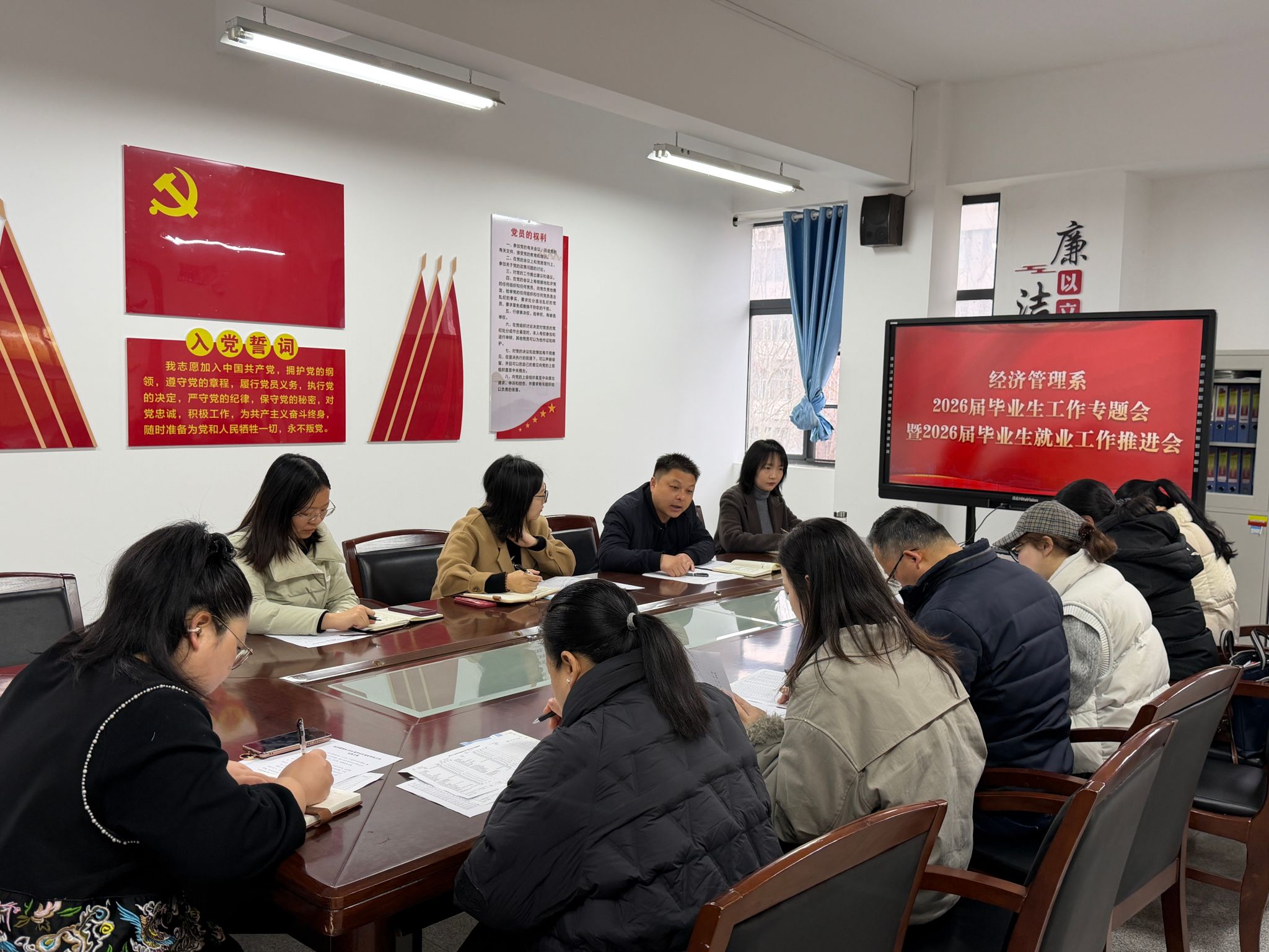 党总支书记徐枫组织学习了学校召开2026届毕业生就业工作推进会会议精神,并就2026届毕业生就业工作进行再动员、再部署、再推进。解读了《经济管理系2026届毕业生就业创业工作实施方案》,进一步明确工作任务、压实工作责任。各毕业班班主任分别汇报了本班当前就业工作基本情况、存在的困难、下一步工作措施。最后,系副主任(主持工作)冀红梅要求凝聚全员合力,精准摸排毕业生就业需求,分类施策、拓展渠道,全力推动2026届毕业生高质量就业。