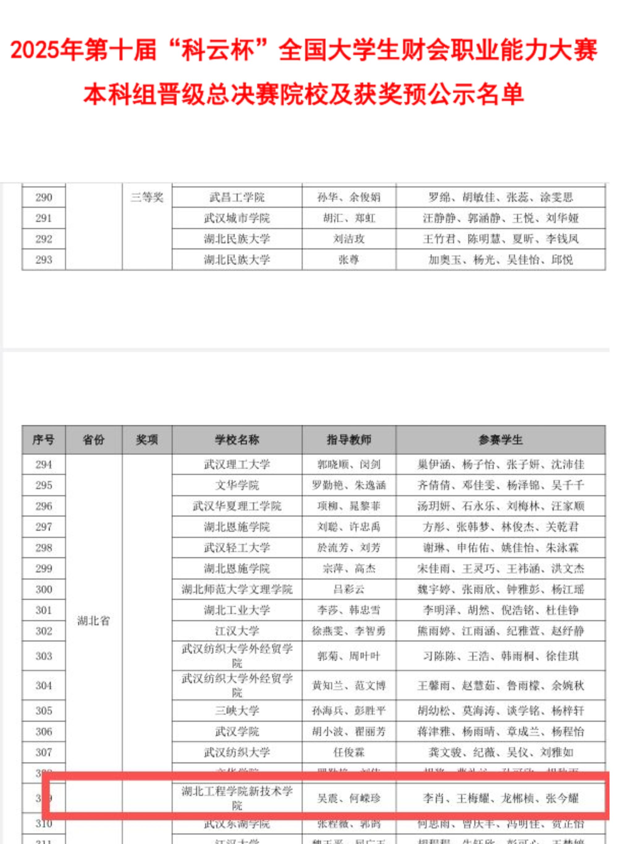 11月23日,由中国商业会计学会主办、厦门科云信息科技有限公司承办的第十届“科云杯”全国大学生财会职业能力大赛全国总决赛圆满落幕。在我系吴震、何嵘珍老师的悉心指导下,由2024级财务管理专业李肖、王梅耀、龙郴桢、张今耀四位同学组成的“小羊肖恩”团队表现优异,荣获全国三等奖。